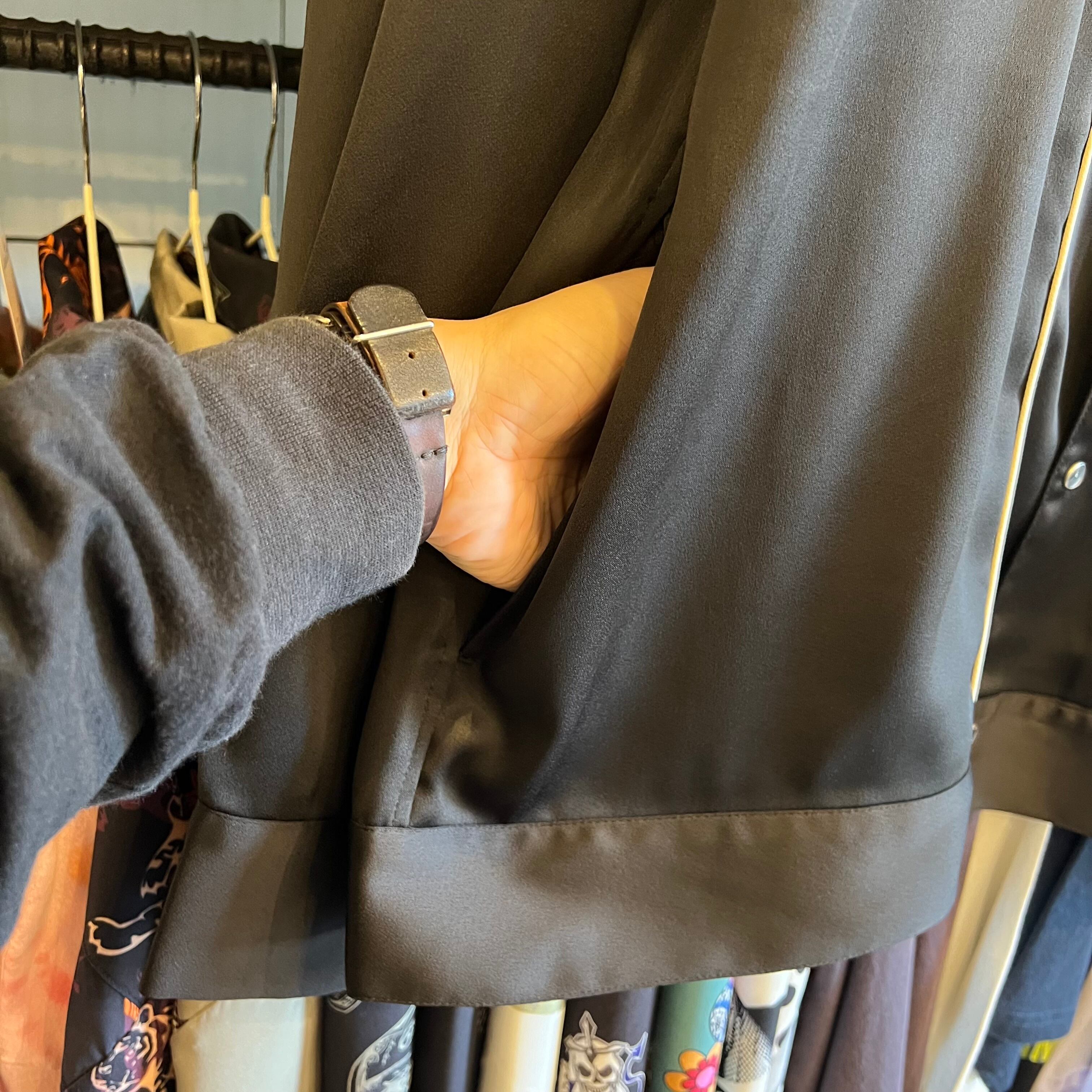 ウエスタンジャケットの型をベースに、しなやかでドレープ性のあるサテン生地にて製作。