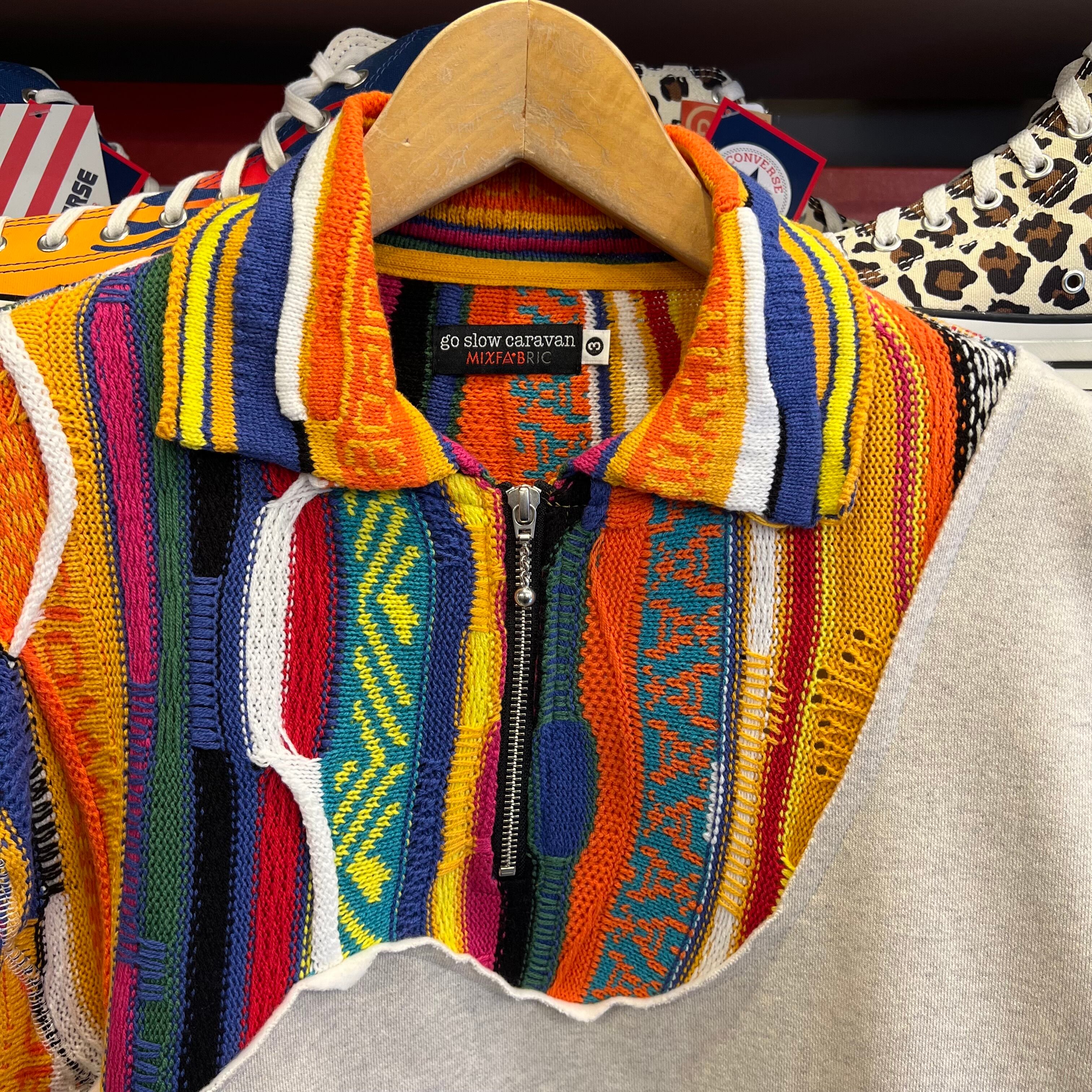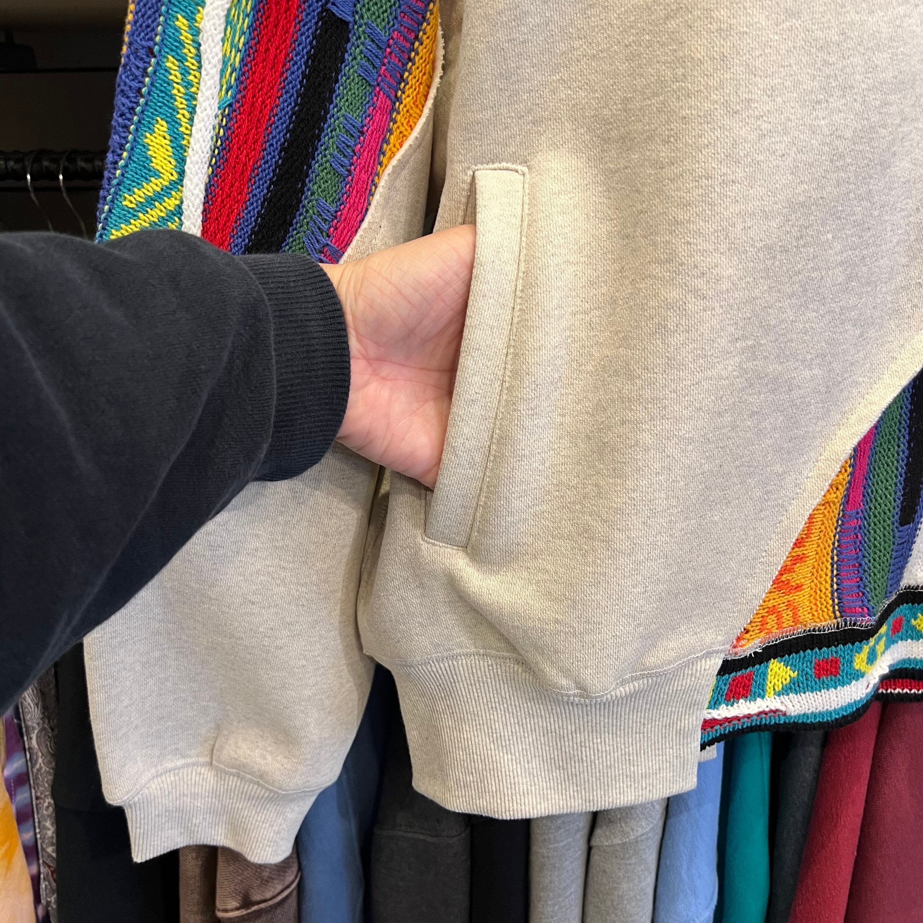 厚みのあるスウェット素材と、クレイジーなジャガードニットを変則的に切り替えた襟付きのハーフZIP仕様。