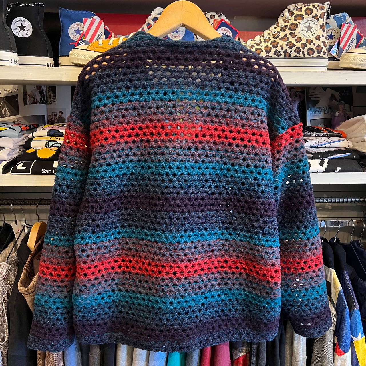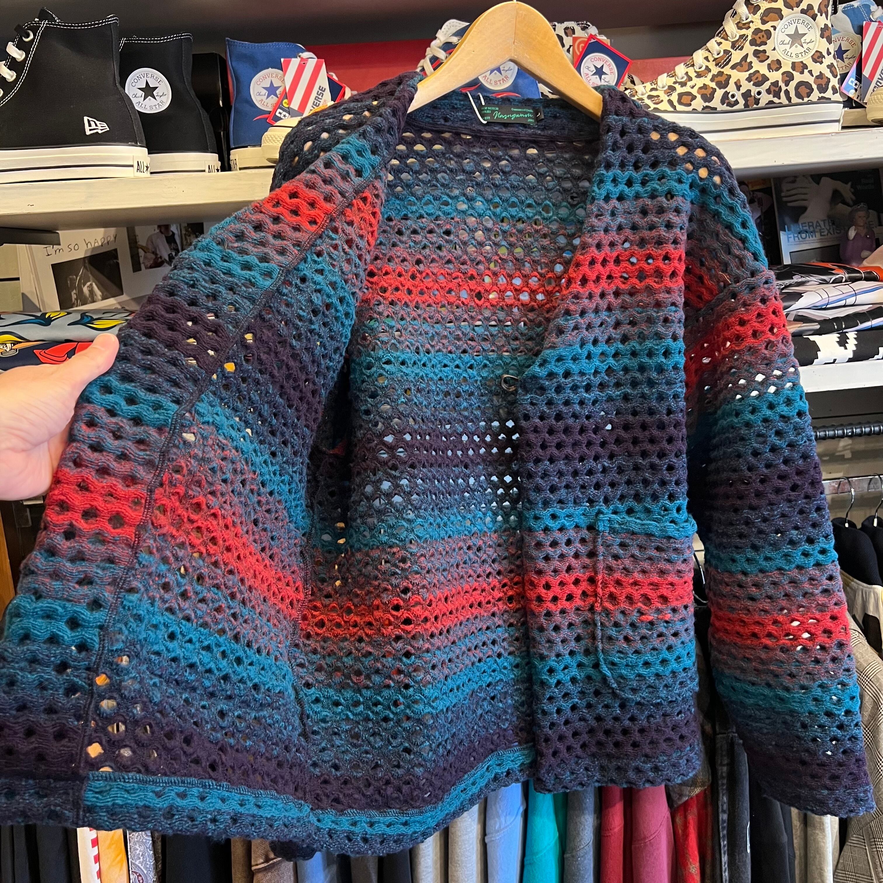 目の粗い鍵編みのようなカーディガン。