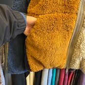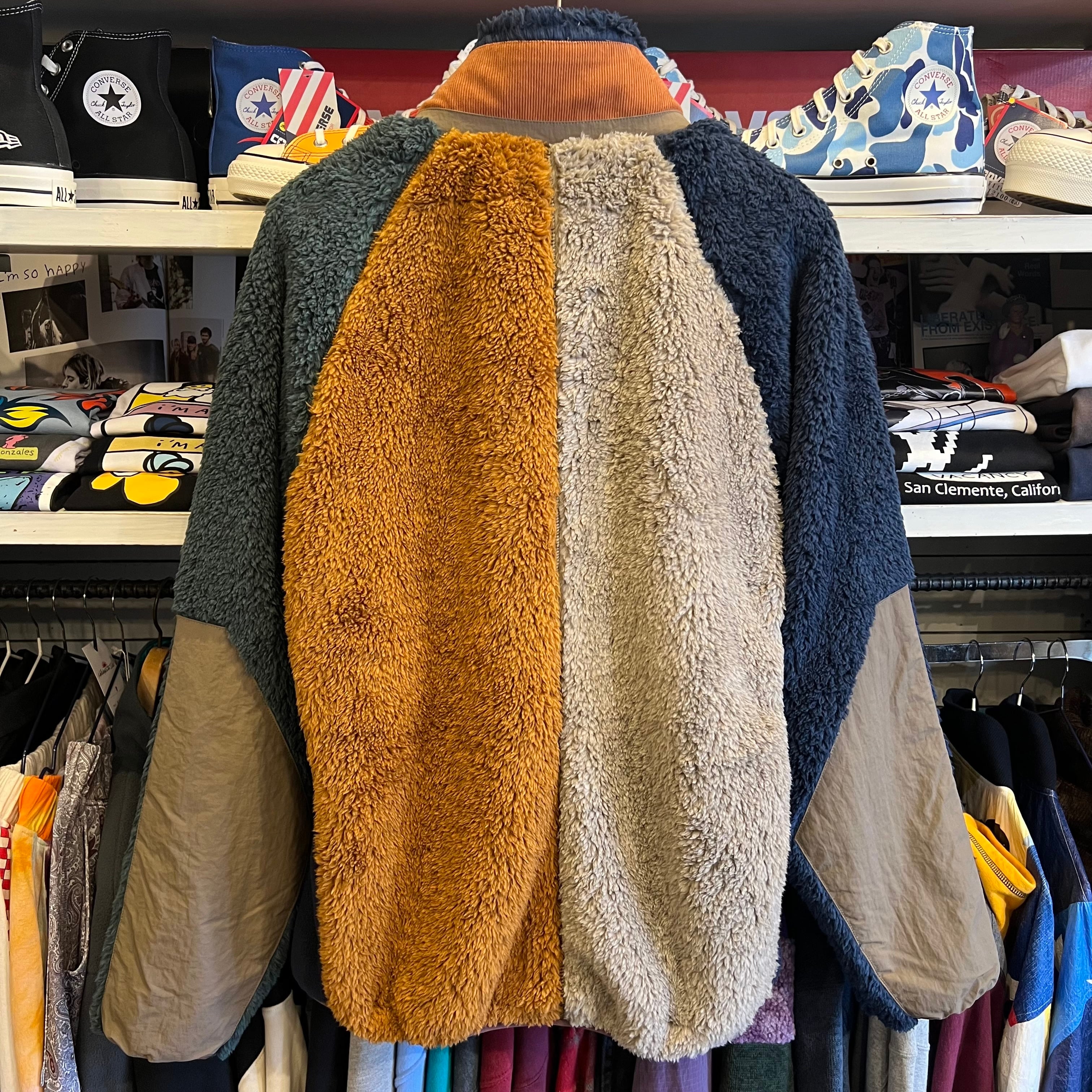 フワフワの起毛、コーデュロイ、マイクロフリース、ナイロン、様々な素材とカラーにて切り替えたクレイジーデザインが特徴的です。