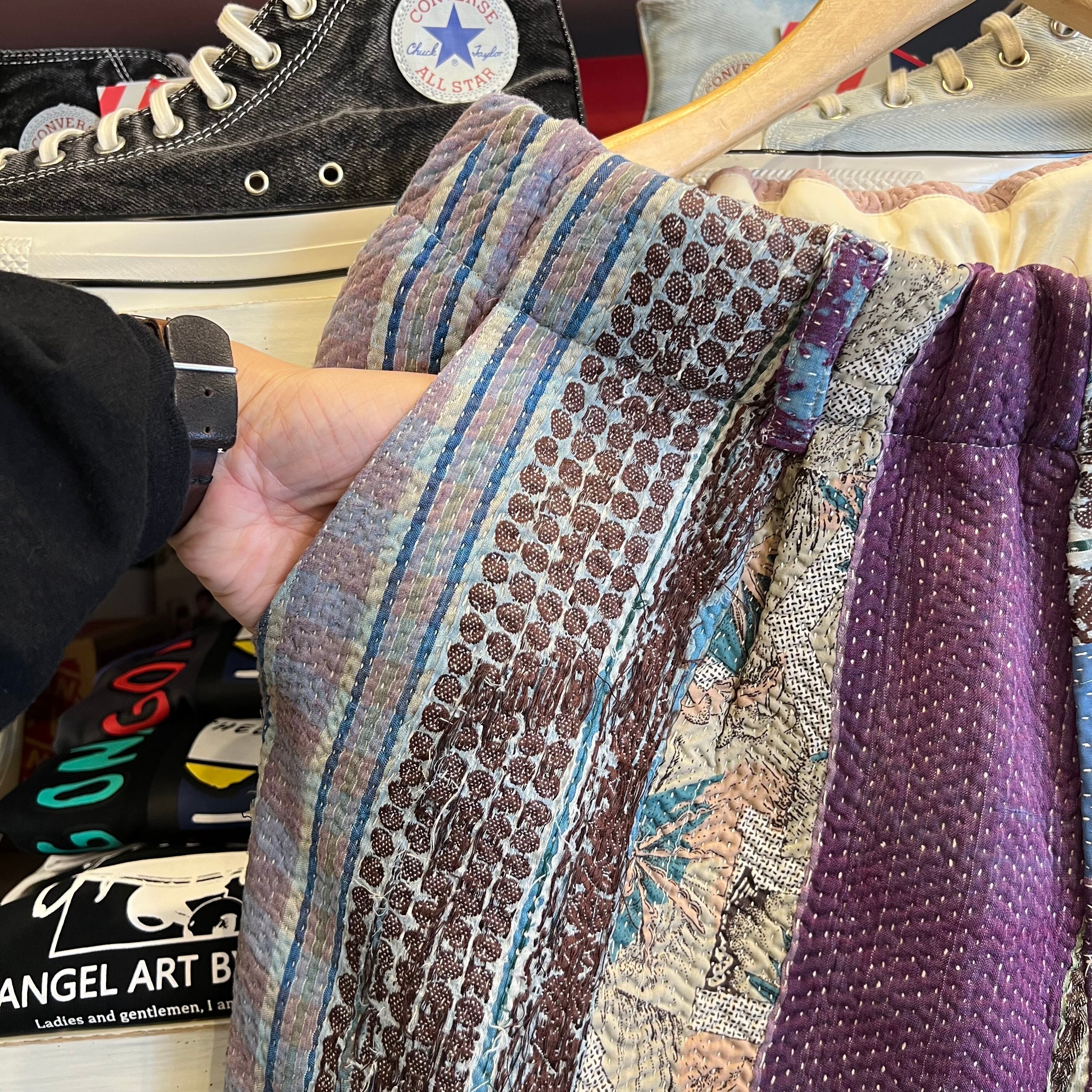 インドはものを⼤切にする⽂化があり、⼥性が⾃宅で着古したサリーを重ねて刺し⼦を施し、ベットシーツや敷物等にします。